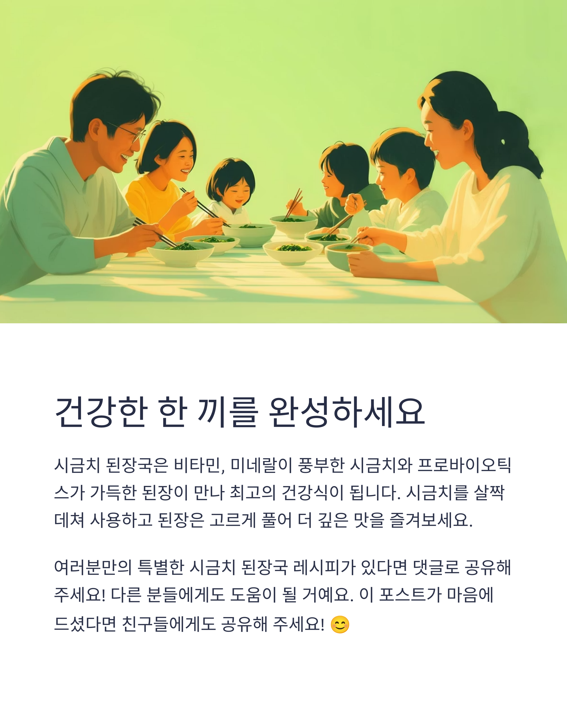 여러분은 시금치 된장국을 만들 때 어떤 비법을 사용하시나요? 다양한 팁과 경험을 댓글로 공유해 주세요!